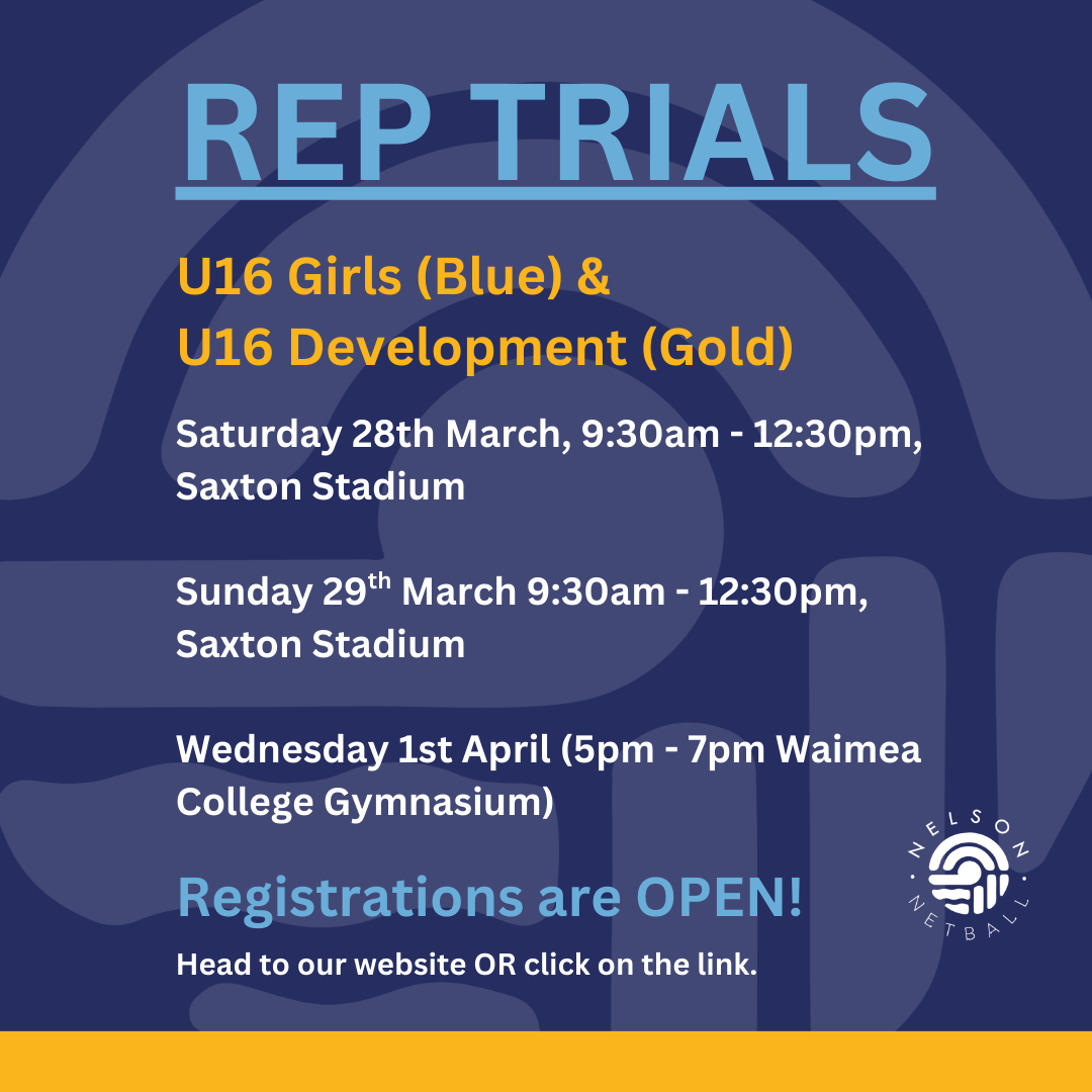 U18 Tournaments: King's Birthday, Christchurch, Saturday 30th April - Tuesday 2nd June (One day off school will be required for return travel). Top Of The South, Blenheim, Sunday 7th June. (One day only). Nationals, Christchurch, Sunday 12th - Thurday 16th July.